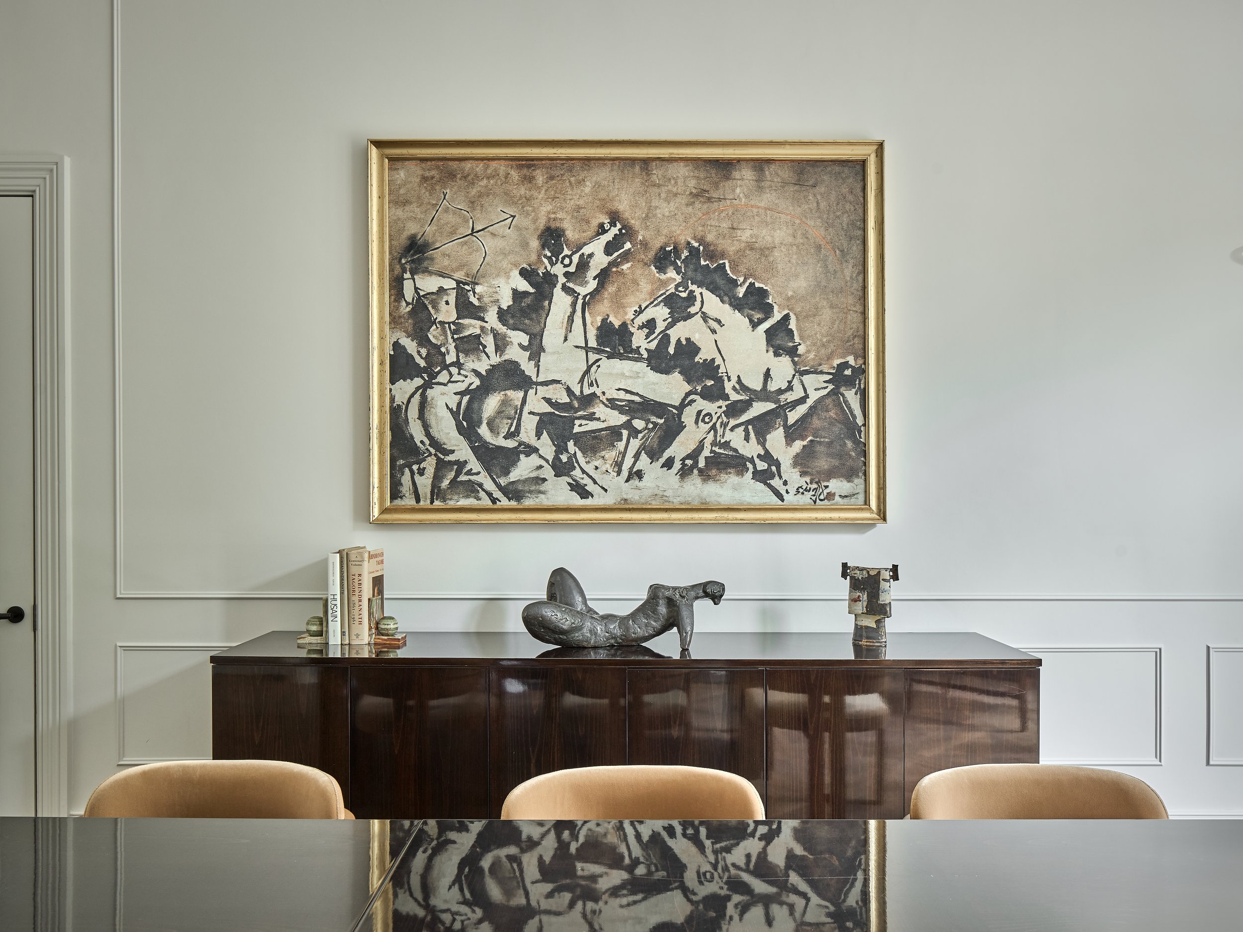 For more than a decade, our Clients had amassed an impressive collection of Indian art. The open-plan reception and dining room provided the perfect gallery-like backdrop, allowing these treasured pieces to take centre stage and complete their vision of a vibrant, elegant family home