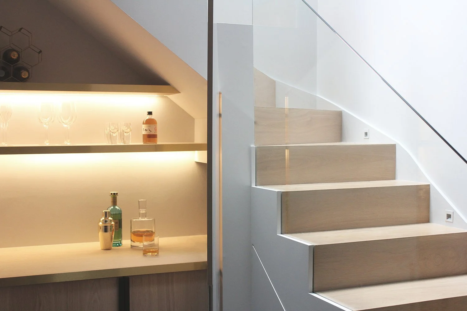 The large basement space was a key addition, with an integrated lightwell to maximise light. The basement was designed on modular proportions, either as a fully open party space, or enclosed to become a series of modules, including home study, a gym, and family cinema room.