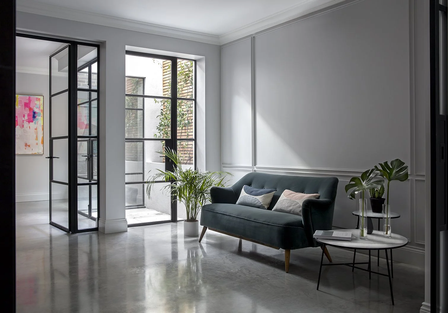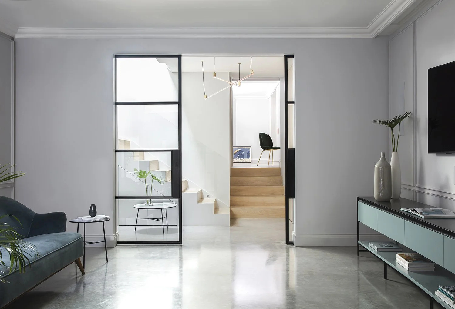 Bespoke black steelwork, echoing the graphic lines of the Crittall glazing, seamlessly integrates the architecture with the interior joinery. Warm wood veneers, plush velvets, and subtle pops of colour soften the stark industrial elements, creating a balanced and inviting atmosphere.